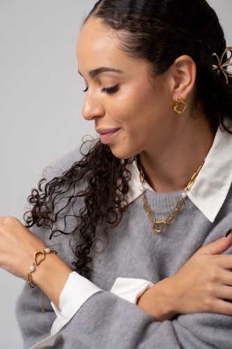 Łańcuszek z geometrycznych ogniw przełamują naturalne perły, dzięki czemu biżuteria wygląda niezwykle nowocześnie i ponadczasowo.