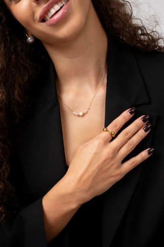 Neris Gold to połączenie minimalizmu i subtelnego blasku. Delikatny złoty łańcuszek z nieregularną perełką i drobnymi koralikami tworzy biżuterię, która przyciąga spojrzenia prostotą i elegancją. To klasyka w nowoczesnym wydaniu - lekka, kobieca i pełna uroku.