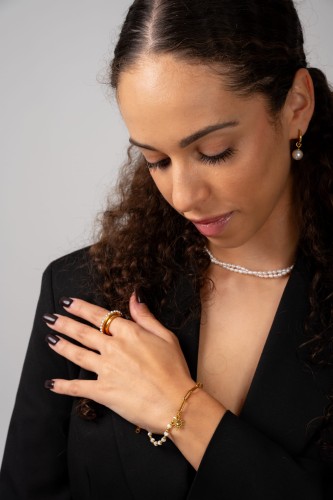 - Wykonany z pereł słodkowodnych i mosiądzu pozłacanego 18-karatowym złotem, zachowuje trwałość i szlachetny wygląd na długo.