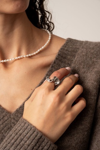 Nyx Silver to pierścionek o wyjątkowej, rzeźbiarskiej formie, który łączy minimalistyczny styl z artystycznym charakterem. Jego płynny, nieregularny kształt sprawia wrażenie, jakby metal miękko układał się wokół palca, tworząc nowoczesną i elegancką kompozycję.